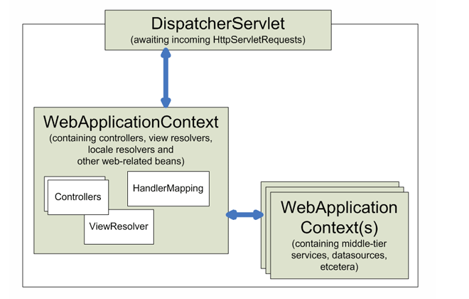 SpringMVC重新整合了Servlet和Jsp,通过DispatchServlet解析分发请求给Controller层,控制层处理分发到Service层,最后由Repository层负责与数据库通信,一切完成后再由DispatchServlet解析视图结果并返回,后端服务逻辑和前端控制器进一步解耦